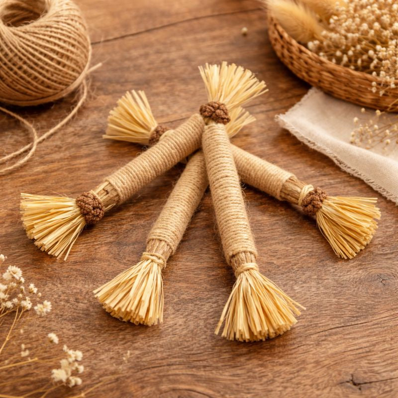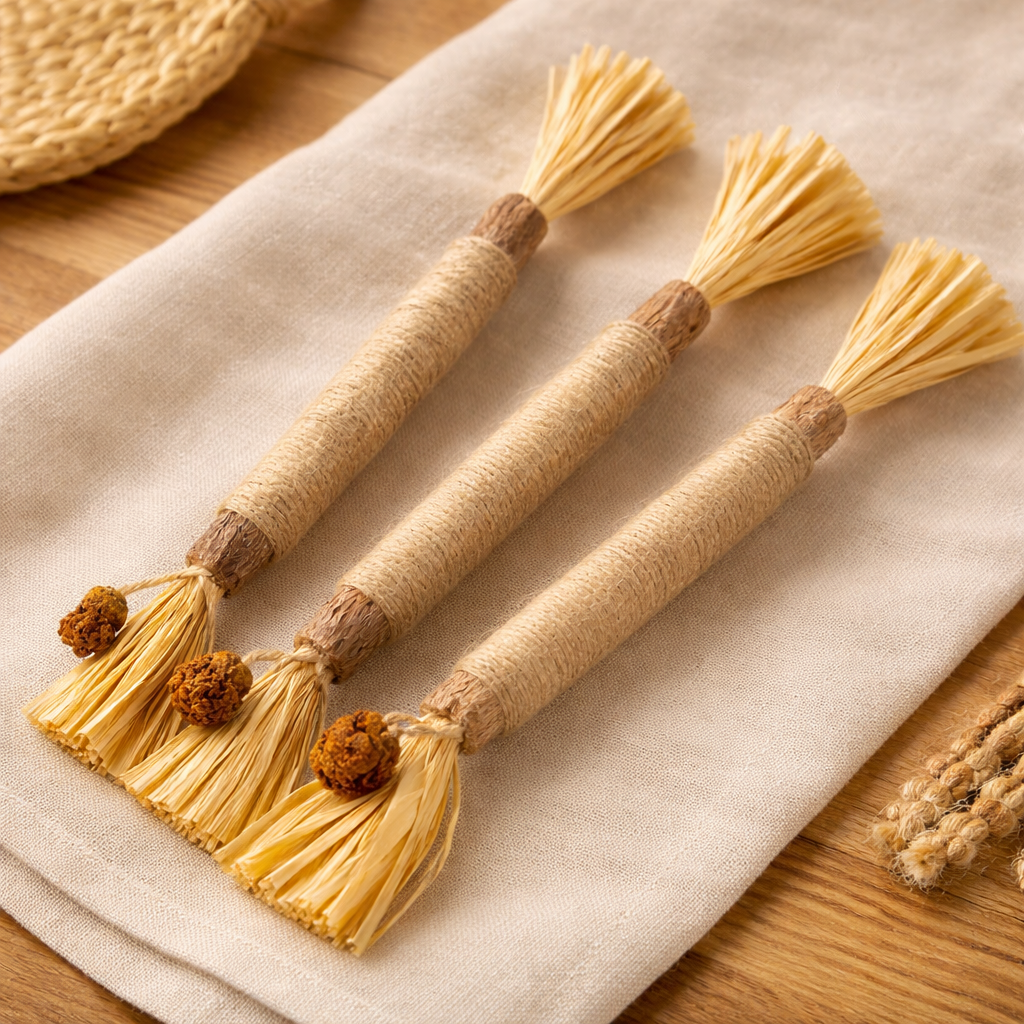 Cada palillo está hecho de madera de vid plateada natural y sin tratar, luego atado a mano con frutas de galle y fibras. Por lo tanto, no hay dos iguales, lo que contribuye a su encanto. Las pequeñas variaciones en forma, color o tamaño son normales.